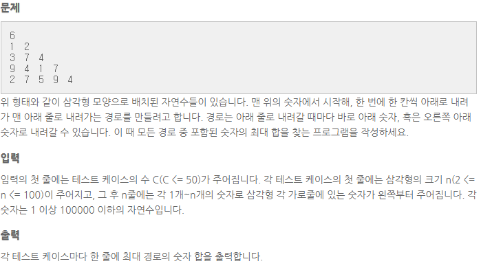 문제 : 삼각형 위의 최대 경로 (난이도 下)