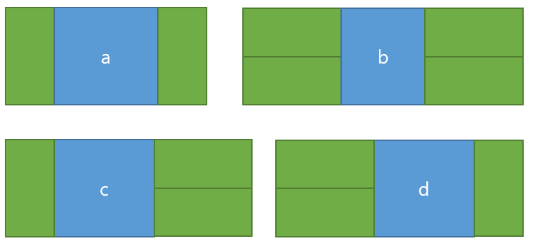 a, b인경우 대칭이기에 재귀 호출을 통해 해결하고 c, d인 경우 비대칭이므로 파란색 부분을 덮는 전체 경우의 수를 반환하면 된다.