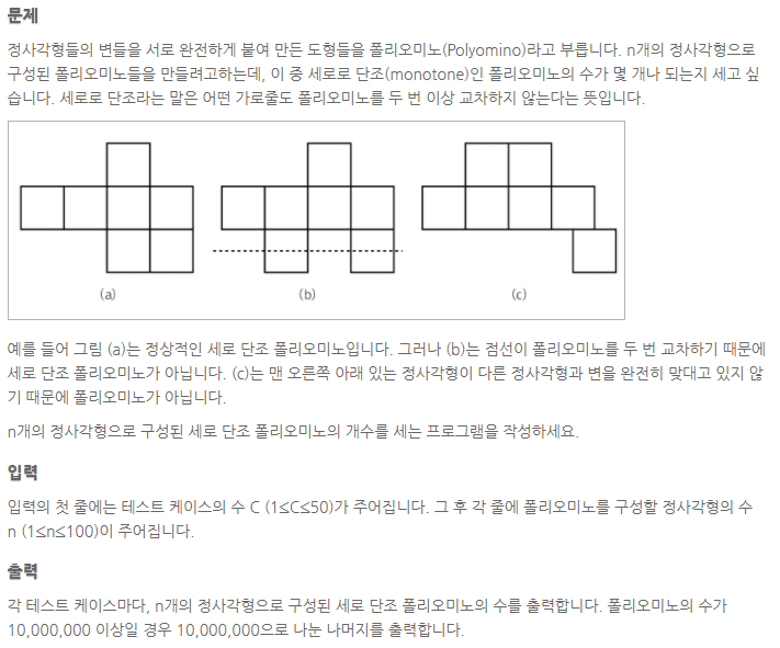 일단 poly(n) = n개의 정사각형으로 만들 수 있는 세로 단조 폴리오미노의 수를 반환한다고 하자.