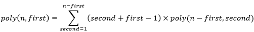1st row의 정사각형 개수를 firsts라고 할 때, poly(n, first) 함수를 정의하자. poly 함수는 n개의 정사각형을 포함하되, 1st row에 first개의 정사각형이 들어가는 폴리오미노의 수를 반환한다.