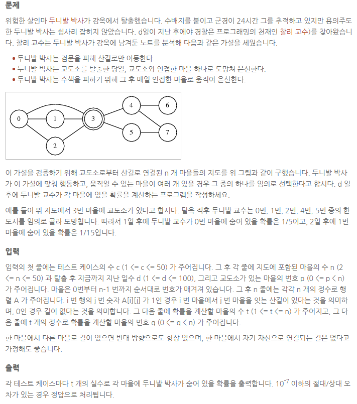문제 : 달팽이 (난이도 : 下) 분석 처음 풀면 매우 당황스러운 문제이다. 경우의 수를 구하는 것과 달리 확률은 어떻게 처리할지 고민이 된다. 그러나 코드를 한번 보고 나면 어떻게 처리할지 감