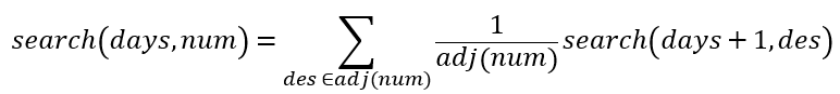 search(days, num) = 탈옥 d일 후 두니발 박사가 num 마을에 있을 확률이라 할 때, search를 다음과 같은 점화식으로 표현할 수 있다.