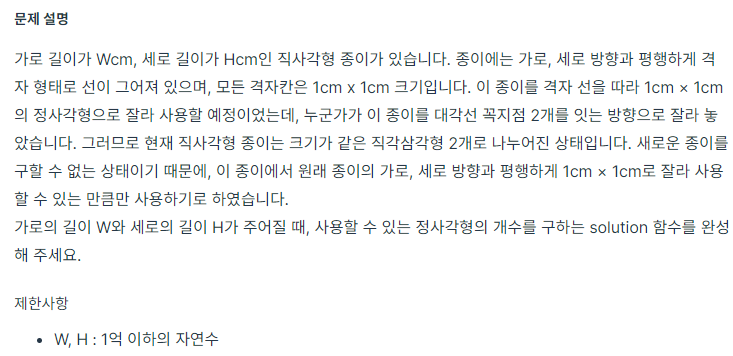 블록의 크기는 (w / gcd) x (h / gcd) 이다. (gcd는 주어진 수의 최대 공약수이다.)