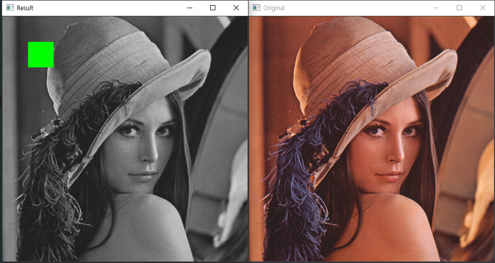 컬러 사진을 흑백 사진으로 변환한 뒤 픽셀을 조작해서 초록색 사각형을 그리는 과정을 구현한다고 하자. 이때 흑백으로 변환하는 과정은 내부 함수가 아닌 BT.708 식을 이용해서 하자.