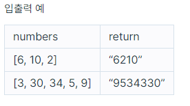 0 또는 양의 정수가 주어졌을 때, 정수를 이어 붙여 만들 수 있는 가장 큰 수를 알아내 주세요.