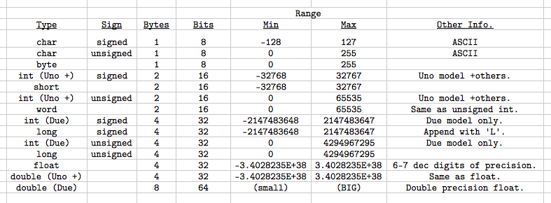 참고로 아두이노 내에서 data type 크기가 보통 사용하는 data type 보다 작다.
