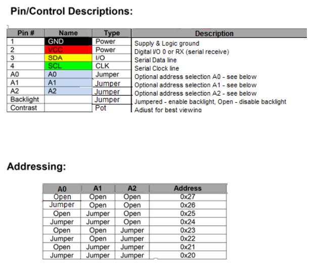 2x16 모두 사용하니 주소를 0x27로 설정하자. 한 가지 주의할 점은 lcd 출력은 SBCS에 해당하는 값만 가능하다. 물론 비트맵을 직접 구성하거나, 값을 넘길 때 2바이트 단위로 직접 인코딩해주면 한글도 가능하긴 하다. (어렵고 귀찮아서 그렇지..)