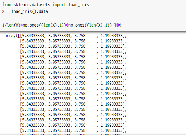 이 데이터로 행렬 X¯의 값을 계산하라. 이 행렬은 첫 번째 열의 값이 모두 같은 값으로 붓꽃의 꽃받침의 길이(sepal length)의 평균이고 두 번째 열의 값이 모두 같은 값으로 붓꽃의 꽃받침의 폭(sepal width)의 평균, 이런 식으로 계산된 행렬이다.