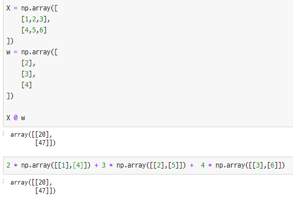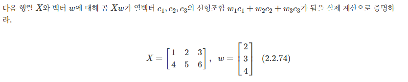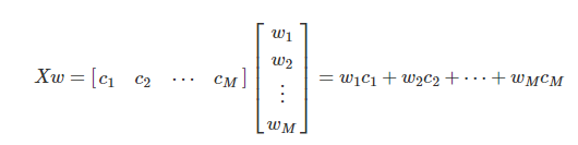 행렬 X와 벡터 w의 곱은 행렬 X의 열벡터 c1, c2 ... 와 벡터 w의 성분 w1 w2, ... 으로 선형조합(linear combination)을 한 결과 벡터와 같다.