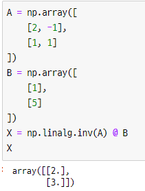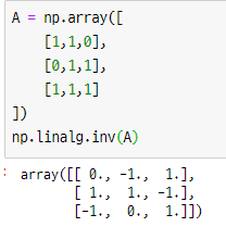 넘파이에서도 inv()라는 명령어를 통해 역행렬을 쉽게 구할 수 있다.