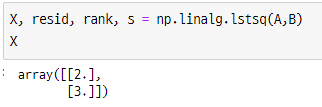 또는 넘파이 명령어인 lstsq()을 이용하자. lstsq()는 행렬 A, B를 인수로 받고 최소승자문제, 랭크, 특이값을 반환한다.